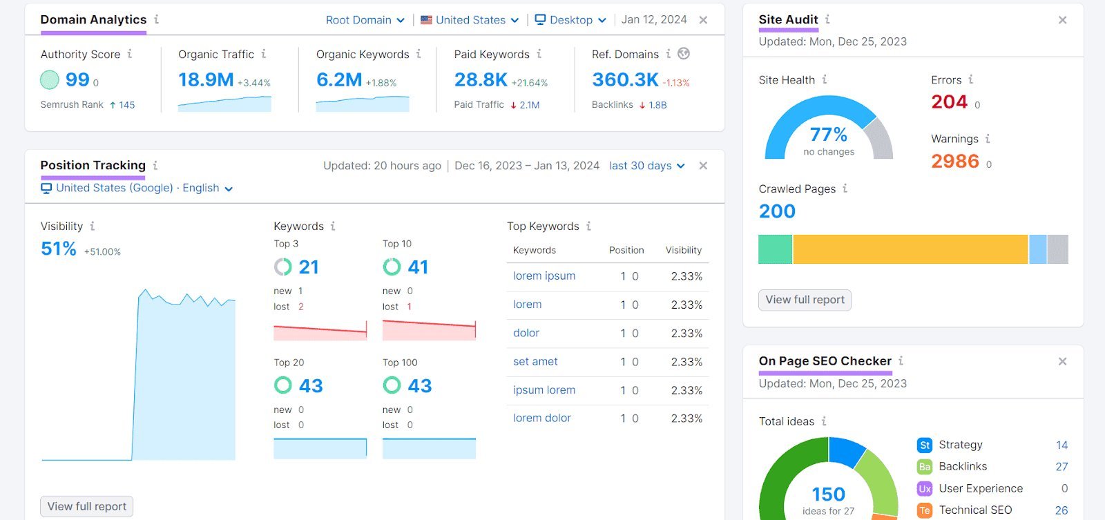 Uno de sus puntos fuertes es la capacidad de mostrar la evolución histórica del posicionamiento de un dominio, lo que permite detectar patrones y tendencias en los cambios de algoritmos de Google. También ofrece análisis de backlinks, auditorías SEO y seguimiento de palabras clave.