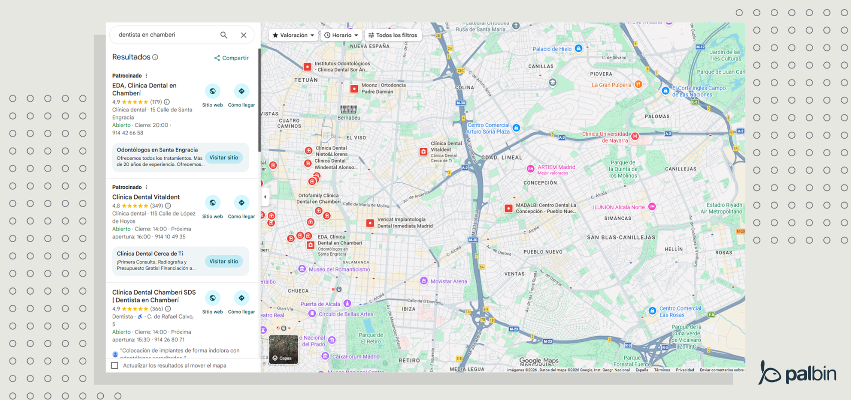 Una persona con dolor de muelas busca “dentista en Chamberí”. En ese momento, Google muestra resultados locales en la ubicación buscada y opciones en Maps con botones directos para llamar o llegar. Si tu clínica dental está bien posicionada y con la campaña Local activa, puedes aparecer justo en ese punto de decisión, cuando el usuario no está investigando por curiosidad, sino que tiene un problema y está buscando una opción a la que ir hoy o la que esté más cercana a su vivienda.