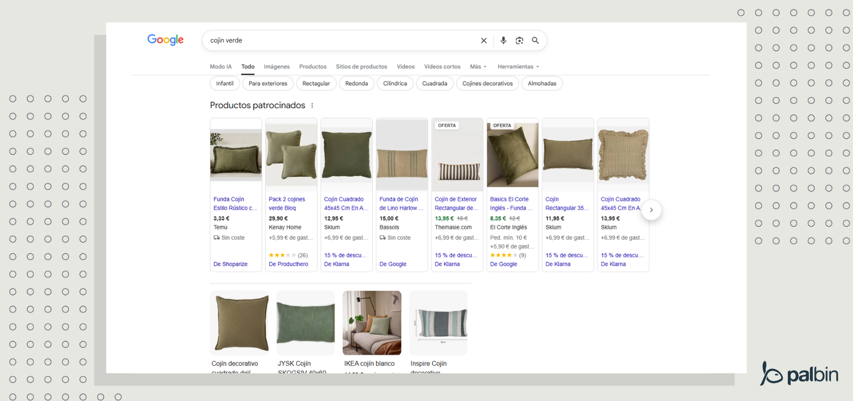 Cuando alguien busca “grifos de cocina negro mate”, Google suele mostrar varias fichas de producto con foto en la parte superior. Estas fichas incluyen precio, imagen de producto y nombre de la tienda. La gran ventaja es que al usuario ya le ha encajado el producto antes de entrar. Si el producto, el diseño y el precio llaman la atención del usuario, el clic suele tener bastante potencial para terminar en compra.